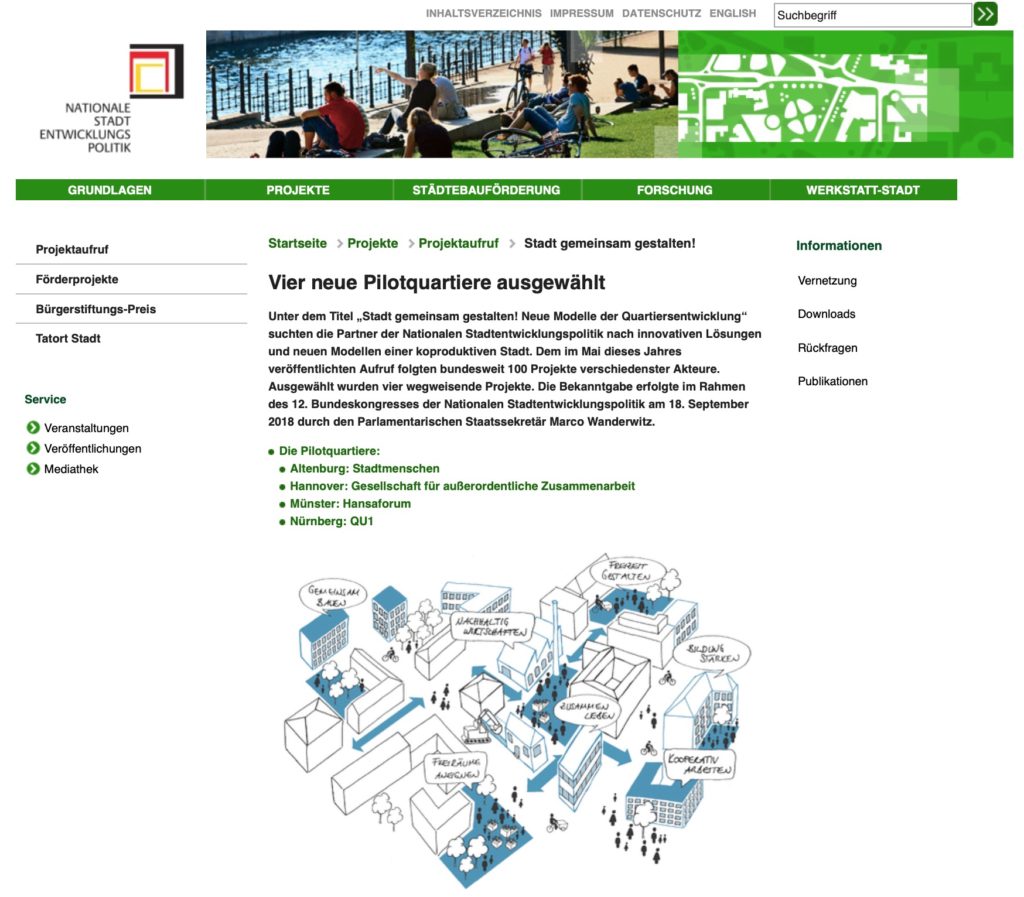 - https://www.nationale-stadtentwicklungspolitik.de/NSPWeb/DE/Projekte/Projektaufruf/Stadt-gemeinsam-gestalten-Neue-Modelle-Quartiersentwicklung/stadt-gemeinsam-gestalten-neue-modelle-quartiersentwicklung_node.html